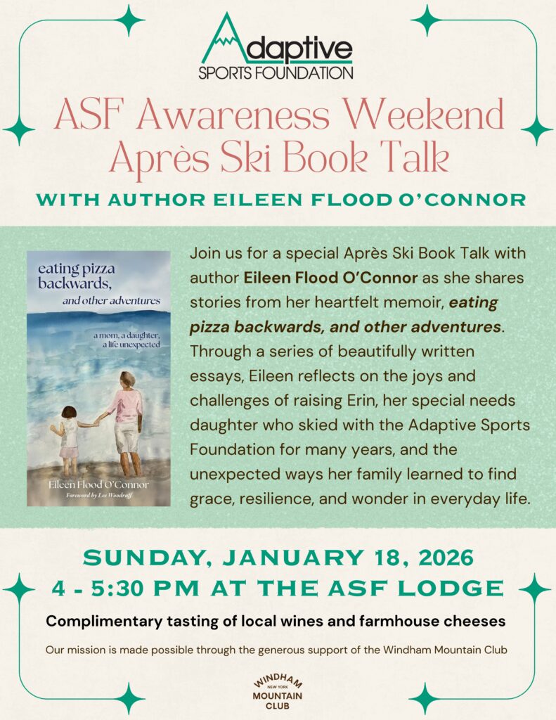On Sunday, January 18, wrap up ASF Awareness Weekend with a special Aprés Ski Book Talk with author Eileen Flood O’Connor as she reads excerpts from her memoir, eating pizza backwards, and other adventures!