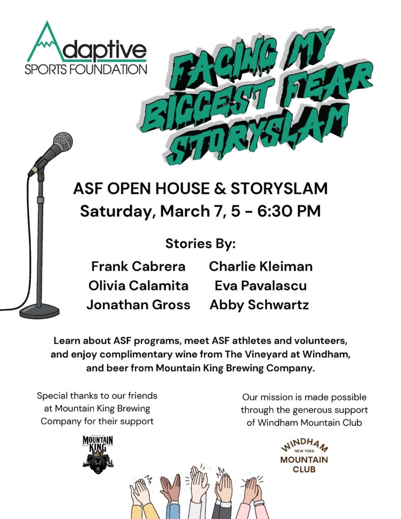 Join us for our first-ever ASF Community StorySlam, an evening of connection and storytelling. While enjoying local wines and brews from The Vineyard at Windham and Mountain King Brewing Company, you’ll hear powerful, personal stories from six individuals – Frank Cabrera, Olivia Calamita, Jonathan Gross, Charlie Kleiman, Eva Pavalascu, and Abby Schwartz – about vulnerability, resilience, and what it takes to face your biggest fear.